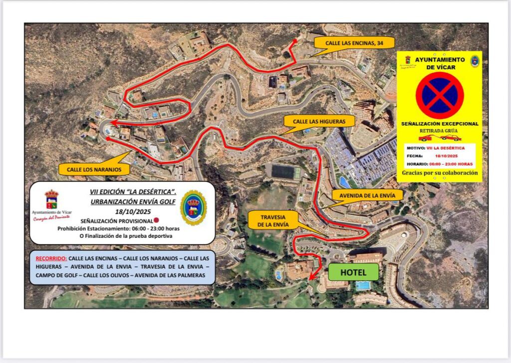 El Ayuntamiento de Vícar ha informado que, en conjunto con los organizadores de la competición, se establecerán restricciones de estacionamiento debido a la celebración de La Desértica, un evento deportivo programado para este fin de semana.