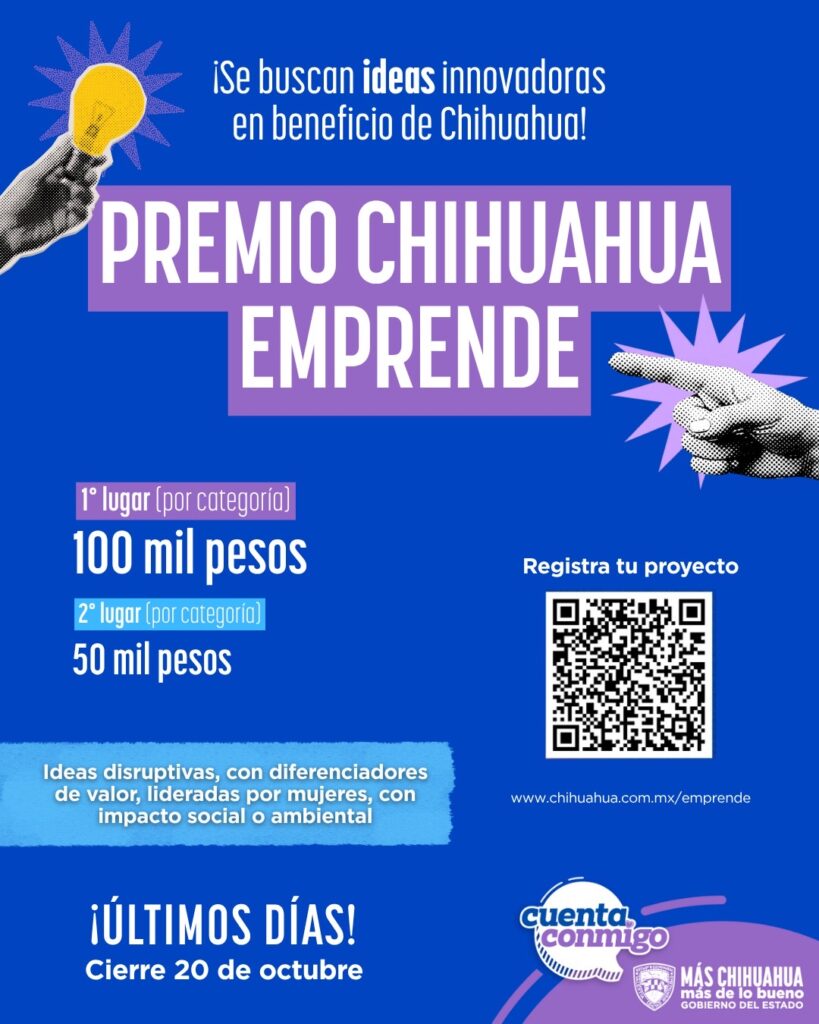 El Gobierno del Estado de Chihuahua, a través de la Secretaría de Innovación y Desarrollo Económico (SIDE), está invitando a todos los emprendedores de la región a participar en la convocatoria del Premio Chihuahua Emprende 2025. Esta oportunidad permanecerá abierta hasta el 20 de octubre.