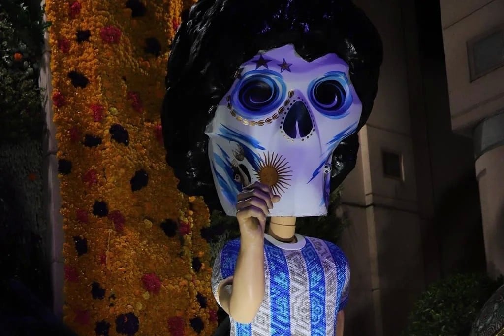 Una de las obras más destacadas es el auto de Fórmula 1 de Ayrton Senna, confeccionado con siete millones de chaquiras. Esta escultura, que se exhibe en el Hotel Marquis Reforma, mide cinco metros de longitud y representa una obra a escala real. La catrina de Diego Armando Maradona, que también forma parte de la colección, muestra detalles significativos como “la mano de Dios” y su famoso gol del “barrilete cósmico” en el Mundial de 1986.