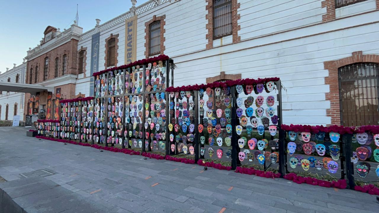 La exposición de arte comunitario titulada “Tzompantli” se está llevando a cabo en la fachada del Museo Regional de Cholula, en el marco de la celebración del Día de Muertos.