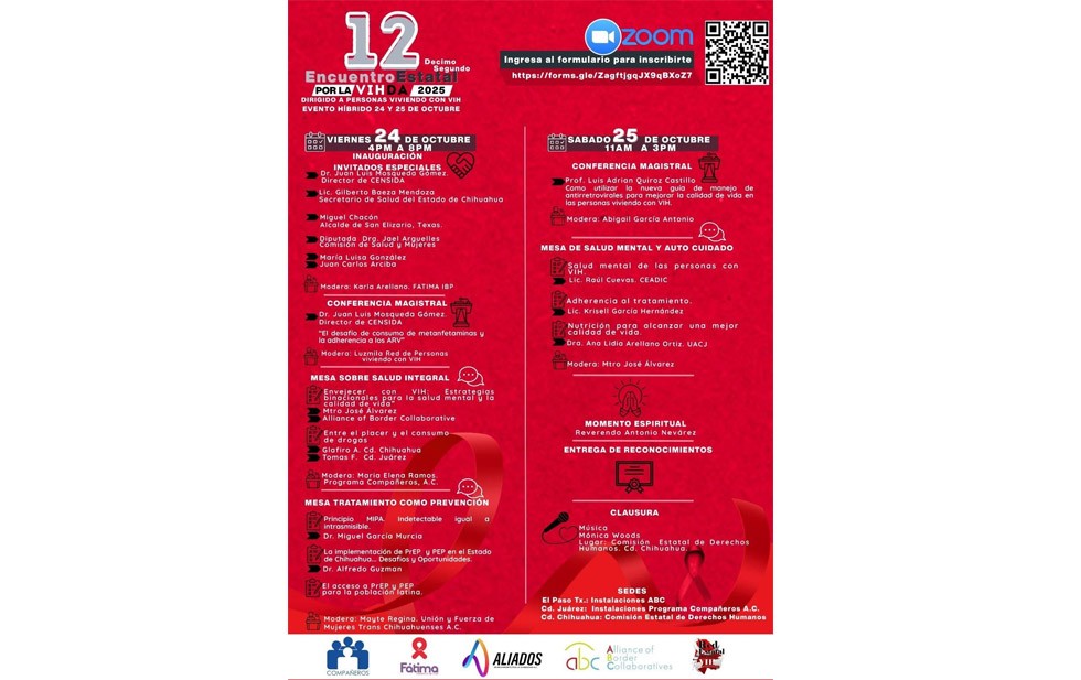 El 12o Encuentro Estatal por la VHIDA, un evento binacional y multidisciplinario, se llevará a cabo los días 24 y 25 de octubre de 2025. Este encuentro se realiza con el objetivo de fomentar la participación comunitaria y fortalecer la respuesta estatal ante la pandemia del VIH. Organizaciones como Compañeros A.C. de Ciudad Juárez, ABC de El Paso, Texas, la Red Estatal de personas con VIH, Aliados en Movimiento por la Diversidad A.C. y Fátima I.B.P. se han unido para hacer posible este evento.