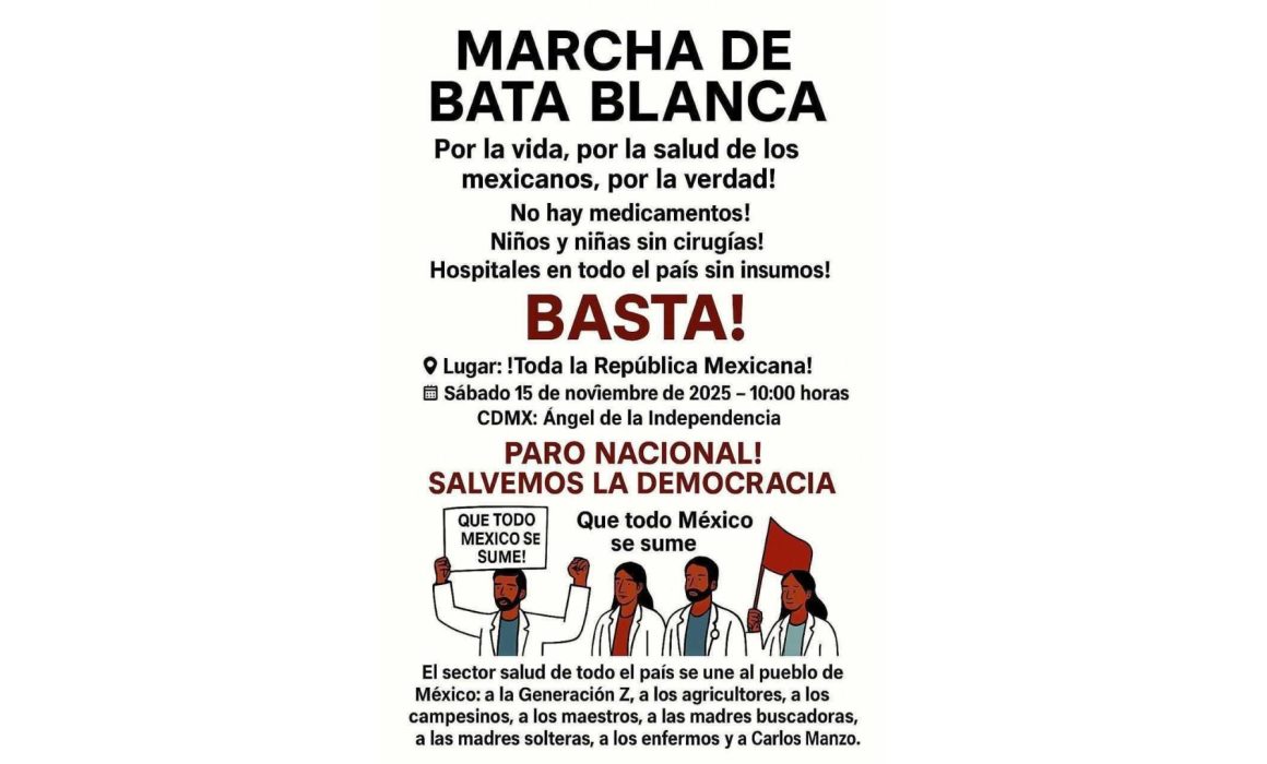 MORELIA, Mich., 7 de noviembre de 2025.– En respuesta a la crisis sanitaria que enfrenta el país, el sector salud ha convocado a la Marcha de Bata Blanca, que se llevará a cabo en la Ciudad de México el próximo 15 de noviembre. El objetivo de esta movilización es exigir soluciones a los problemas de abasto de medicamentos en hospitales públicos.