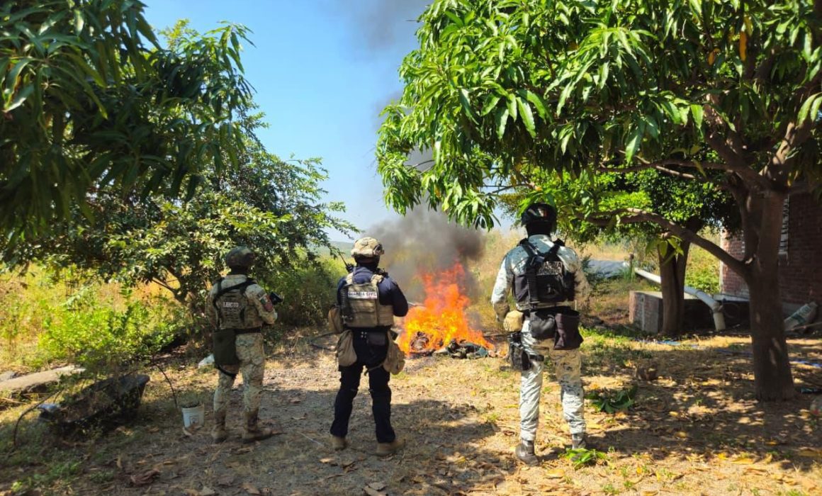 BUENAVISTA, Mich., 8 de noviembre de 2025.- Las secretarías de Seguridad Pública (SSP) y de la Defensa Nacional llevaron a cabo un operativo en el municipio de Buenavista, donde se localizaron e incineraron cuatro campamentos clandestinos, presuntamente utilizados por grupos delictivos.