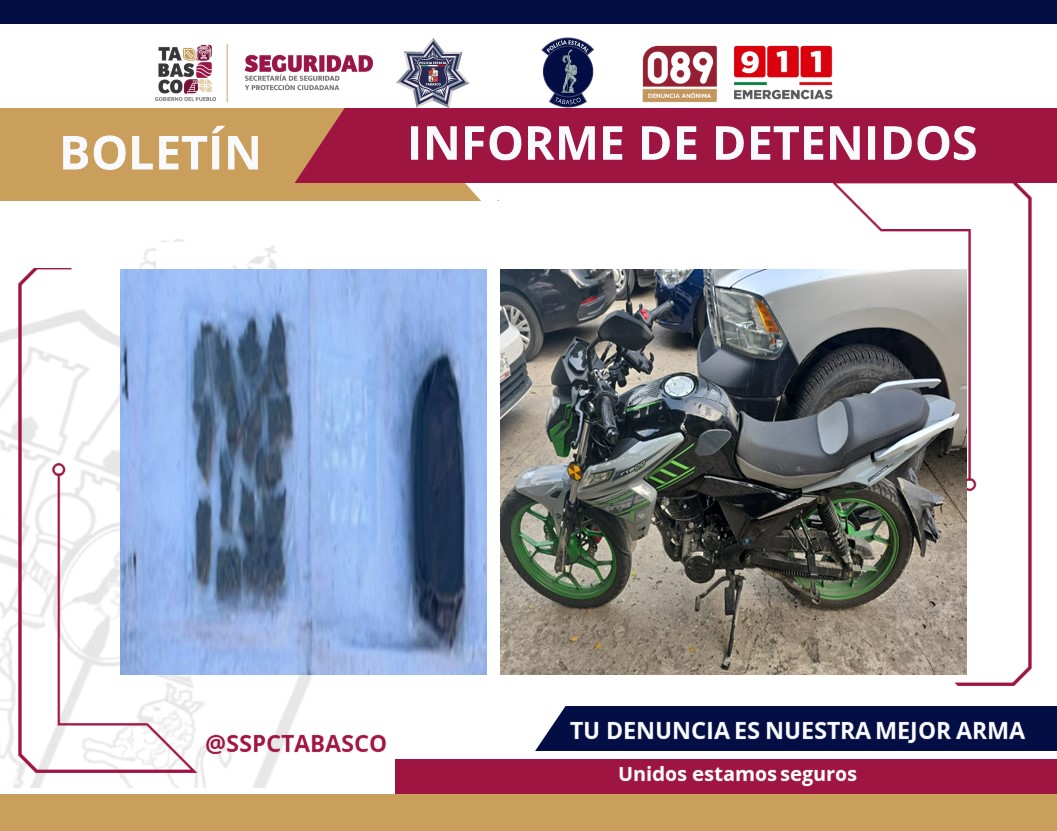 El detenido junto con las evidencias y la motocicleta fueron entregados a las autoridades competentes para el inicio de los trámites legales correspondientes.