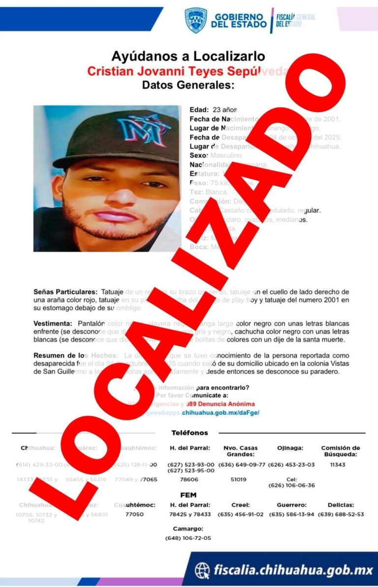 La Unidad de Investigación de Personas Ausentes y/o No Localizadas de la Fiscalía de Distrito Zona Centro logró localizar a un adolescente identificado con las iniciales A.A.M.G., de 16 años, quien tenía un reporte de ausencia en la ciudad de Chihuahua.