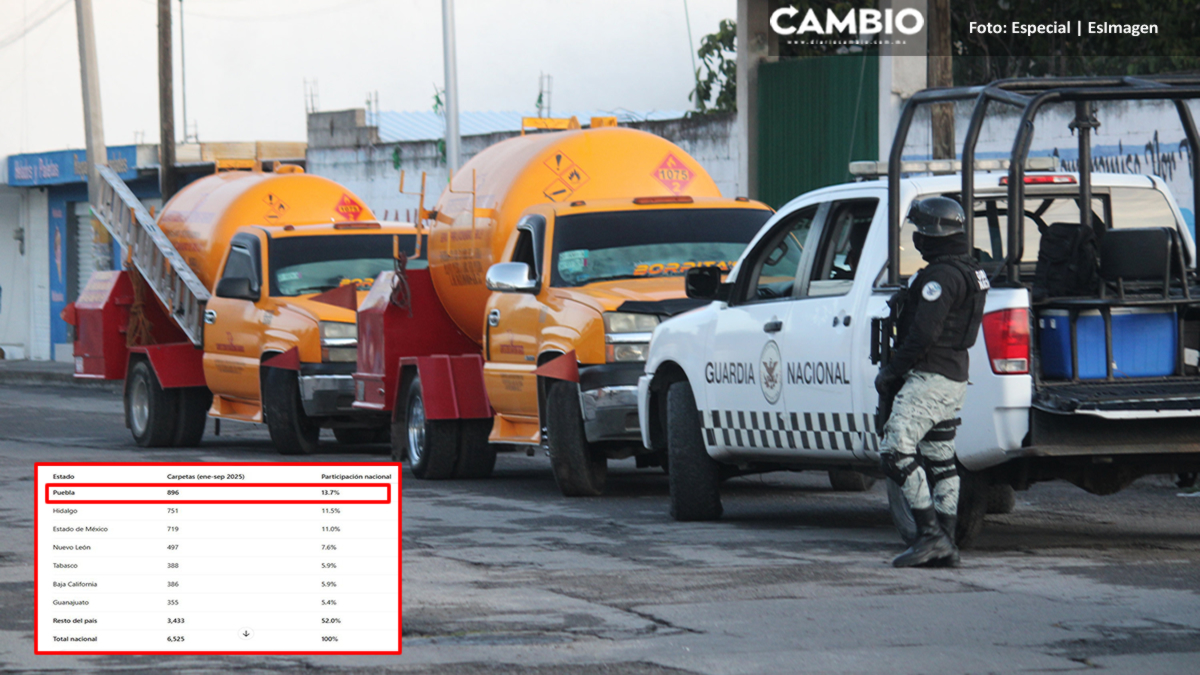Según datos proporcionados por la Fiscalía General de la República (FGR), Puebla lidera a nivel nacional en investigaciones de huachicol, concentrando el 13.7% del total nacional, que asciende a 6,525 carpetas abiertas en los primeros nueve meses de 2025.