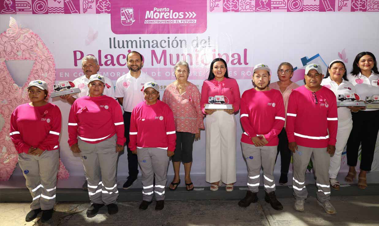 Puerto Morelos – La presidenta municipal Blanca Merari Tziu Muñoz encabezó el Encendido Rosa del Palacio Municipal como parte de la campaña “Que no SENOS olvide” durante el Mes Rosa de lucha contra el cáncer de mama, reafirmando la importancia de la prevención y la detección temprana.