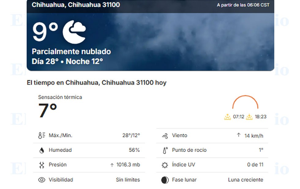 Chihuahua inicia este domingo con una temperatura fresca de 9 grados centígrados, según reporta el portal The Weather Channel. La sensación térmica actual es incluso menor, alcanzando los 7 grados, y el cielo se presenta parcialmente nublado.