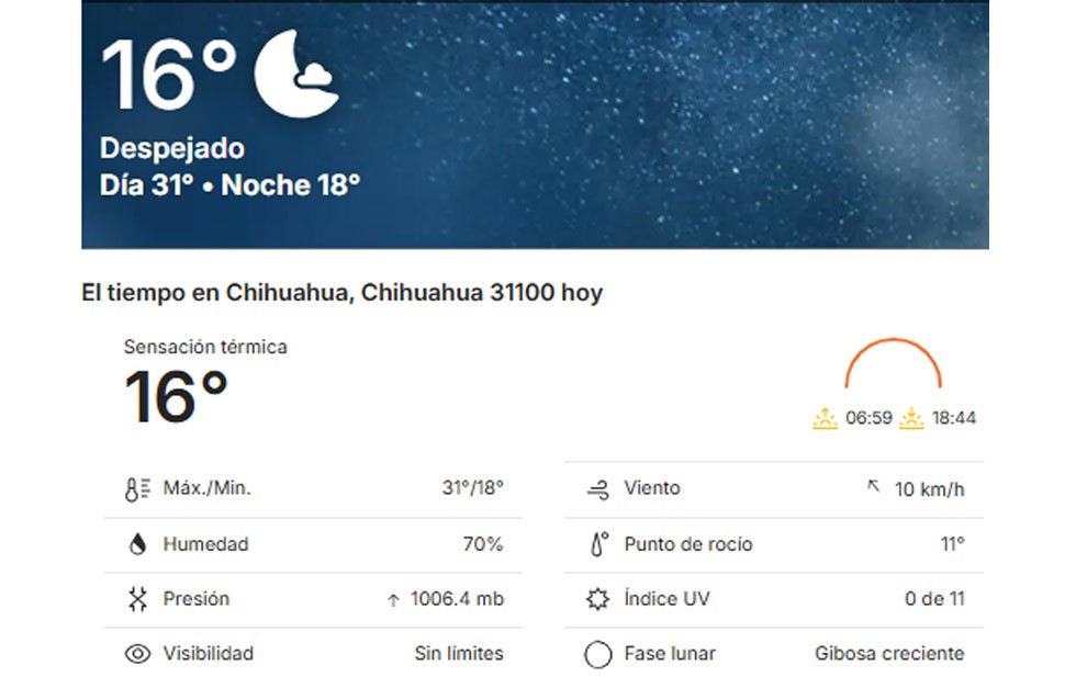 Este domingo, la ciudad de Chihuahua experimentará un clima mayormente despejado, con una temperatura mínima que iniciará en 16 grados centígrados.