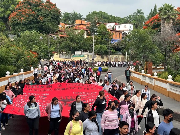 ACTUALIZACIÓN: Cientos de integrantes de la Federación de Estudiantes Campesinos Socialistas de México (FECSM) marchan en Cuernavaca, Morelos, exigiendo la renuncia de aproximadamente 20 docentes de la escuela normal rural “Gral. Emiliano Zapata”, quienes no han asistido a clases desde junio de este año.