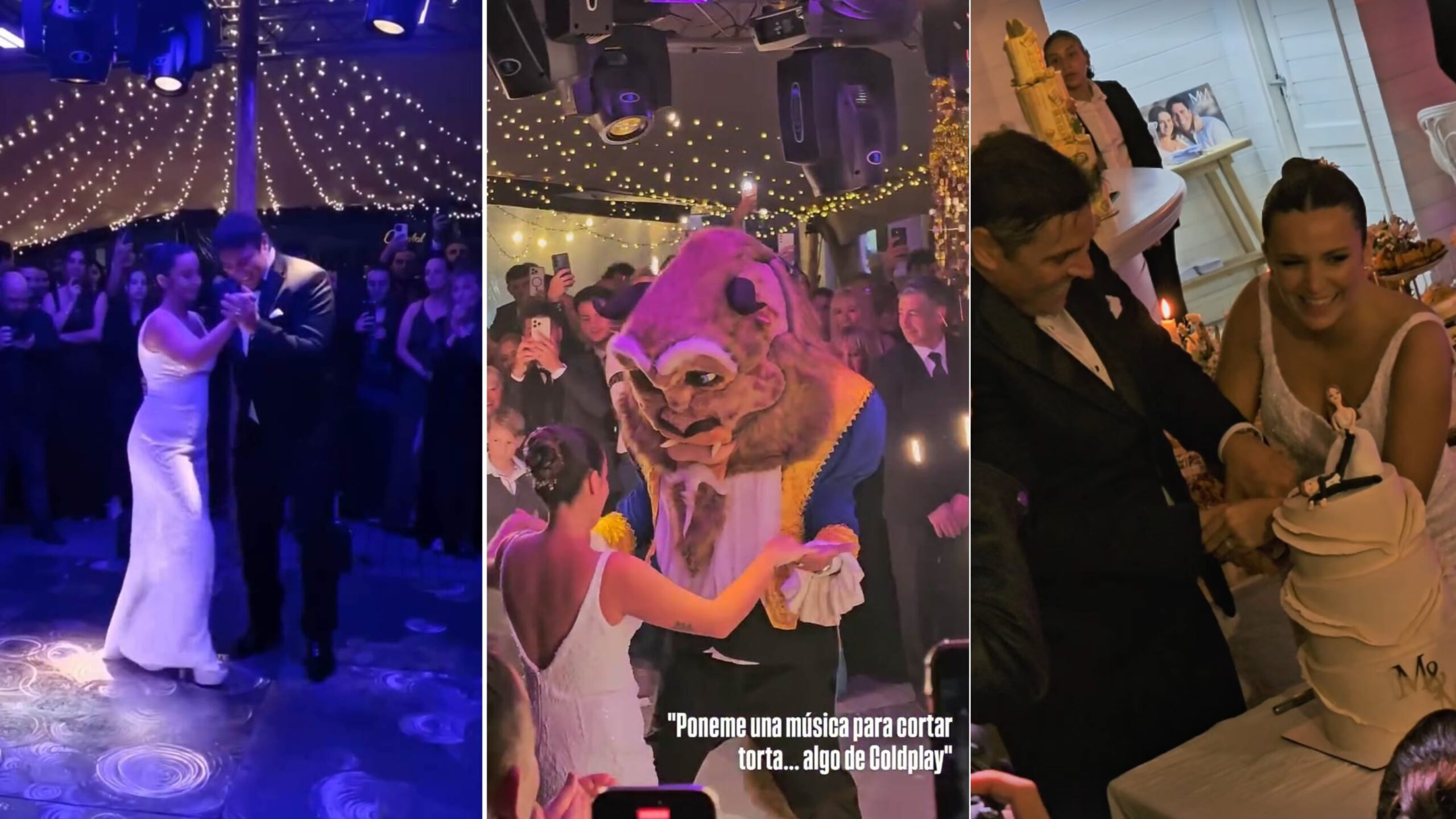 El tradicional vals dio paso rápidamente a una fiesta fuera de lo común. Martina y Matías recrearon un divertido baile de La Bella y la Bestia, que fue un guiño viral a sus looks civiles que se habían convertido en memes días antes. Además, Roberto Peña aportó un toque humorístico con sus imitaciones y la icónica recreación del “saltito del cofre de la felicidad” al estilo Silvio Soldán.