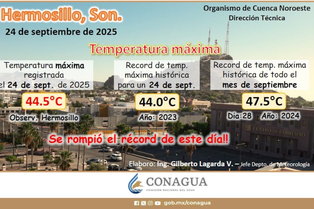 Además, Conagua confirmó que se superó la temperatura máxima de 44 grados centígrados que había sido registrada en la misma fecha el año pasado. La cifra más alta que se ha registrado en septiembre en la capital de Sonora fue el año anterior, cuando se alcanzaron los 47.5 grados centígrados el 28 de este mes.