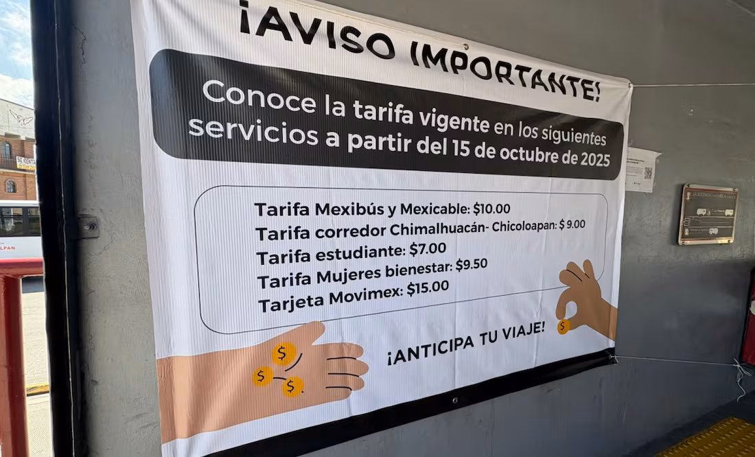 Ciudad de México, 15 de octubre de 2025. Autoridades confirman que a partir de este miércoles, la tarifa del Mexibús y el Mexicable en el Estado de México aumenta oficialmente de 9 a 10 pesos. El costo actualizado ya está vigente y fue informado por medio de lonas colocadas en las estaciones, sorprendiendo a usuarios en sus trayectos habituales.